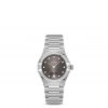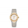 This 29 mm 18K yellow gold and stainless steel model features a bezel engraved with Roman numerals, crystal white slivery dial with diamond hour markers and a date window at the 6 o’clock position. The hands, OMEGA logo, Constellation star and diamond holders are also in 18K yellow gold.