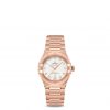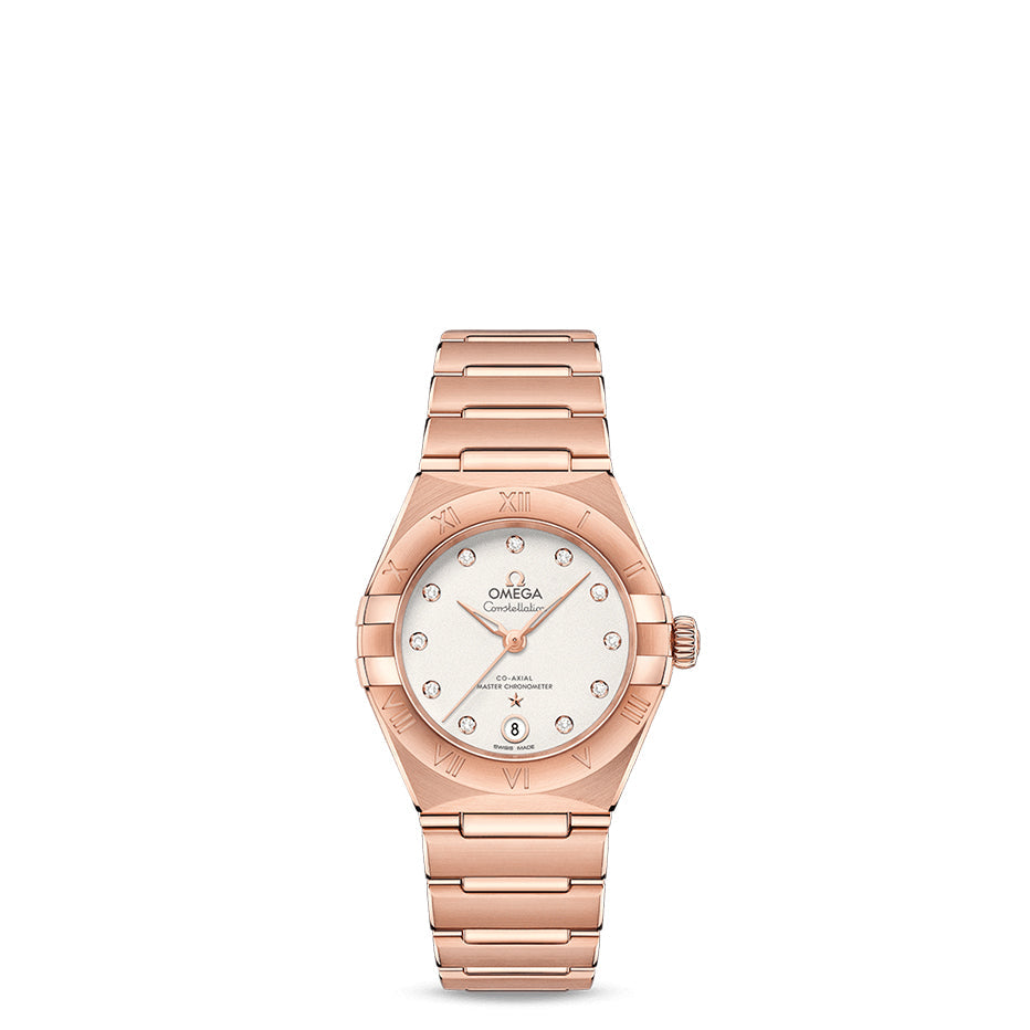 This 29 mm 18K Sedna™ gold model features a bezel engraved with Roman numerals, crystal white silvery dial with diamond hour markers and a date window at the 6 o’clock position. The bracelet, hands, OMEGA logo, Constellation star and diamond holders are also in 18K Sedna™ gold.