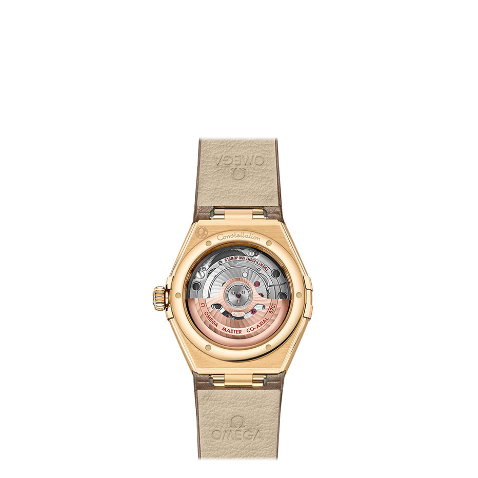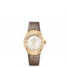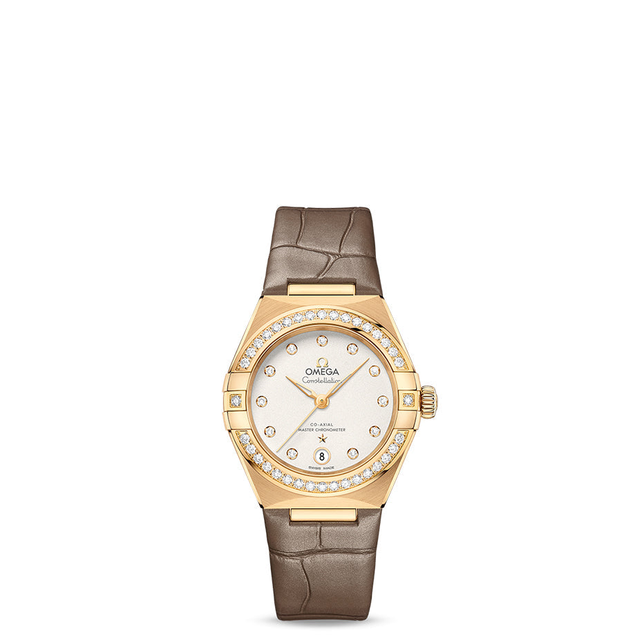 This 29 mm 18K yellow gold model features a diamond-paved bezel, crystal white silvery dial with diamond hour markers and a date window at the 6 o’clock position. The hands, OMEGA logo, Constellation star and diamond holders are also in 18K yellow gold.