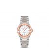 This 29 mm 18K Sedna™ gold and stainless steel model features a bezel engraved with Roman numerals, pearled mother-of-pearl dial and a date window at the 6 o’clock position. The hands, OMEGA logo, Constellation star and indexes are also in 18K Sedna™ gold.