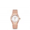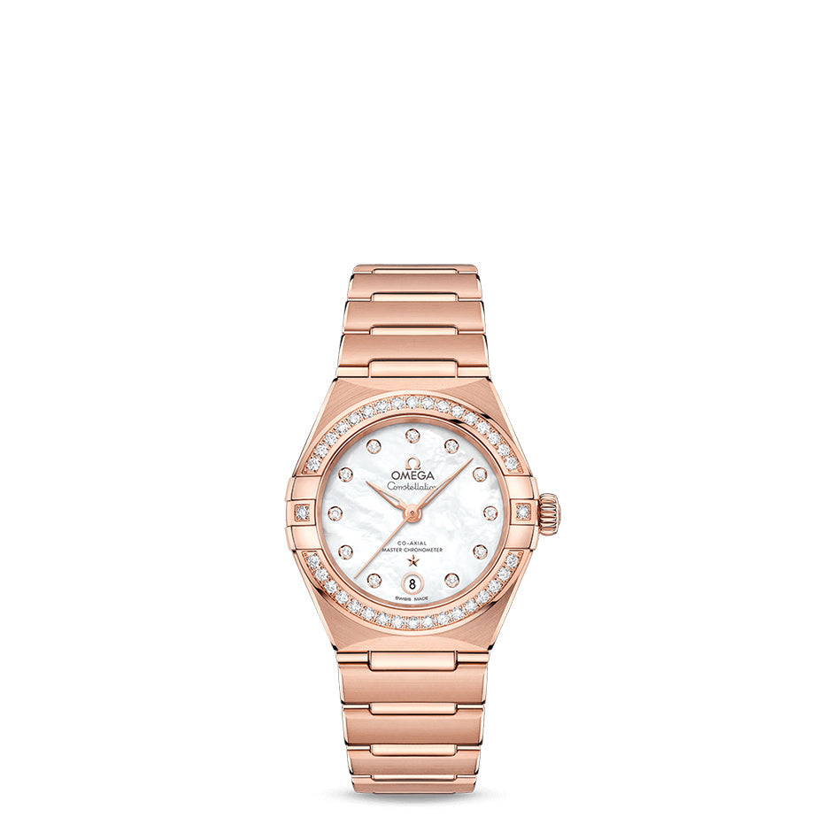 This 29 mm 18K Sedna™ gold model features a diamond-paved bezel, pearled mother-of-pearl dial with diamond hour markers and a date window at the 6 o’clock position. The bracelet, hands, OMEGA logo, Constellation star and diamond holders are also in 18K Sedna™ gold.