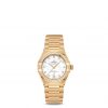 This 29 mm 18K yellow gold model features a diamond-paved bezel, pearled mother-of-pearl dial with diamond hour markers and a date window at the 6 o’clock position. The bracelet, hands, OMEGA logo, Constellation star and diamond holders are also in 18K yellow gold.