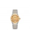 This 29 mm 18K yellow gold and stainless steel model features a bezel engraved with Roman numerals, sun-brushed champagne dial with diamond hour markers and a date window at the 6 o’clock position. The hands, OMEGA logo, Constellation star and diamond holders are also in 18K yellow gold.