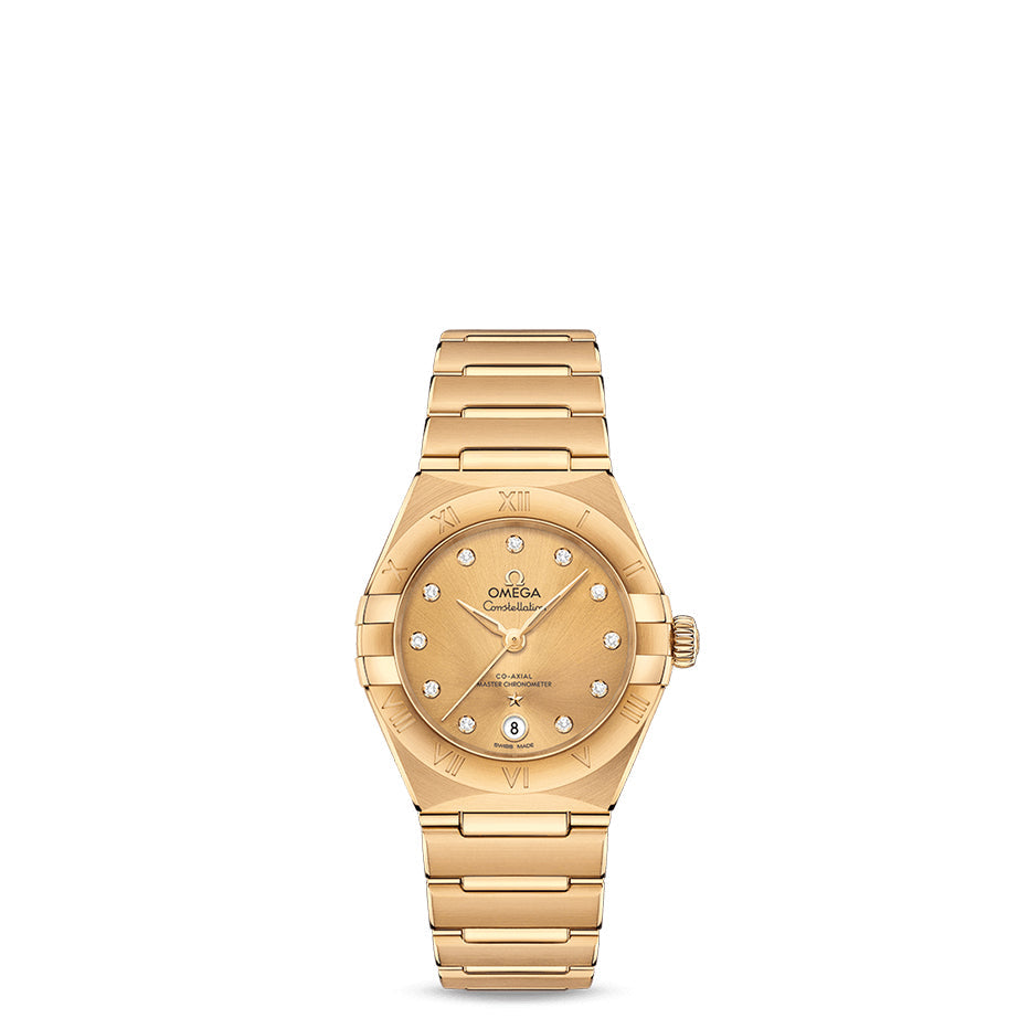 This 29 mm 18K yellow gold model features a bezel engraved with Roman numerals, sun-brushed champagne dial with diamond hour markers and a date window at the 6 o’clock position. The bracelet, hands, OMEGA logo, Constellation star and diamond holders are also in 18K yellow gold.