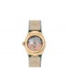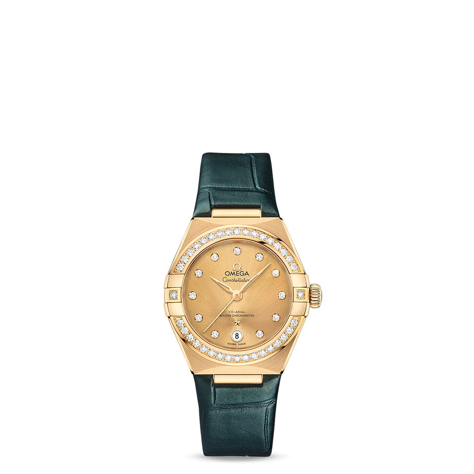 This 29 mm 18K yellow gold model features a diamond-paved bezel, sun-brushed champagne dial with diamond hour markers and a date window at the 6 o’clock position. The hands, OMEGA logo, Constellation star and diamond holders are also in 18K yellow gold.