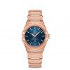 This 36 mm 18K Sedna™ gold model features a bezel engraved with Roman numerals, a sun-brushed blue dial and a date window at the 6 o’clock position. The hands, OMEGA logo, Constellation star and indexes are all in 18K Sedna™ gold.
