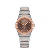 This 36 mm stainless steel and 18K Sedna™ gold model features a bezel engraved with Roman numerals, a sun-brushed brown dial and a date window at the 6 o’clock position. The hands, OMEGA logo, Constellation star and indexes are all in 18K Sedna™ gold.