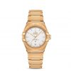This 36 mm 18K yellow gold model features a bezel engraved with Roman numerals, an opaline white silvery dial and a date window at the 6 o’clock position. The hands, OMEGA logo, Constellation star and indexes are all in 18K yellow gold.