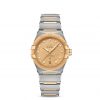 This 36 mm stainless steel and 18K yellow gold model features a bezel engraved with Roman numerals, a silk-embossed champagne dial with diamond indexes and a date window at the 6 o’clock position. The hands, OMEGA logo, Constellation star and diamond holders are all in 18K yellow gold.