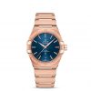 This 39 mm 18K Sedna™ gold model features a bezel engraved with Roman numerals, a sun-brushed blue dial and a date window at the 6 o’clock position. The hands, OMEGA logo, Constellation star and indexes are all in 18K Sedna™ gold.
