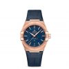 This 39 mm 18K Sedna™ gold model features a bezel engraved with Roman numerals, a silk-embossed blue dial and a date window at the 6 o’clock position. The hands, OMEGA logo, Constellation star and indexes are all in 18K Sedna™ gold.
