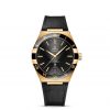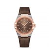 This 39 mm stainless steel and 18K Sedna™ gold model features a bezel engraved with Roman numerals, a sun-brushed brown dial and a date window at the 6 o’clock position. The hands, OMEGA logo, Constellation star and indexes are all in 18K Sedna™ gold.