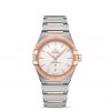 This 39 mm stainless steel and 18K Sedna™ gold model features a bezel engraved with Roman numerals, an opaline white silvery dial and a date window at the 6 o’clock position. The hands, OMEGA logo, Constellation star and indexes are all in 18K Sedna™ gold.