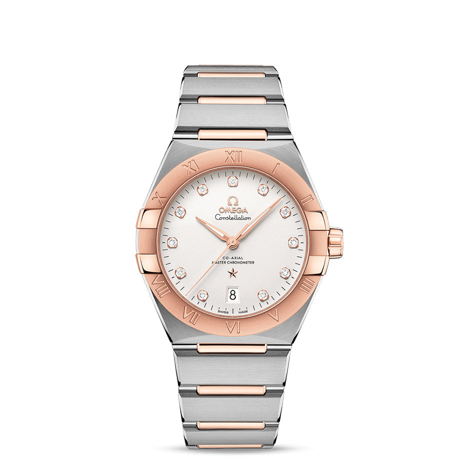 This 39 mm stainless steel and 18K Sedna™ gold model features a bezel engraved with Roman numerals, an opaline white silvery dial with diamond indexes and a date window at the 6 o’clock position. The hands, OMEGA logo, Constellation star and diamond holders are all in 18K Sedna™ gold.