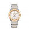 This 39 mm stainless steel and 18K yellow gold model features a bezel engraved with Roman numerals, an opaline silvery dial with diamond hour-markers and a date window at the 6 o’clock position. The hands, OMEGA logo, Constellation star and diamond-holders on the dial are all in 18K yellow gold.