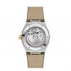 This 39 mm stainless steel and 18K yellow gold model features a bezel engraved with Roman numerals, a silk-embossed white silvery dial and a date window at the 6 o’clock position. The hands, OMEGA logo, Constellation star and indexes are all in 18K yellow gold.
