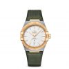 This 39 mm stainless steel and 18K yellow gold model features a bezel engraved with Roman numerals, a silk-embossed white silvery dial and a date window at the 6 o’clock position. The hands, OMEGA logo, Constellation star and indexes are all in 18K yellow gold.