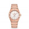 This 39 mm 18K Sedna™ gold model features a bezel engraved with Roman numerals, an opaline creamy silvery dial and a date window at the 6 o’clock position. The hands, OMEGA logo, Constellation star and indexes are all in 18K Sedna™ gold.