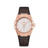 This 39 mm 18K Sedna™ gold model features a bezel engraved with Roman numerals, a silk-embossed creamy silvery dial and a date window at the 6 o’clock position. The hands, OMEGA logo, Constellation star and indexes are all in 18K Sedna™ gold.