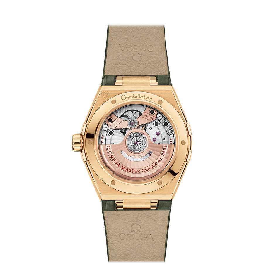 Presented on an olive leather strap, this timepiece is driven by the OMEGA Co-Axial Master Chronometer Calibre 8801, visible through the domed scratch-resistant sapphire crystal.
