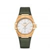 This 39 mm 18K yellow gold model features a bezel engraved with Roman numerals, a silk-embossed white silvery dial and a date window at the 6 o’clock position. The hands, OMEGA logo, Constellation star and indexes are all in 18K yellow gold.