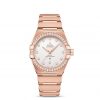 This 39 mm 18K Sedna™ gold model features a diamond-paved bezel, an opaline silvery dial with diamond hour-markers and a date window at the 6 o’clock position. The hands, OMEGA logo, Constellation star and the diamond-holders on the dial are all in 18K Sedna™ gold.
