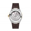 This 41 mm model, in stainless steel and 18K Yellow gold, features a brown polished ceramic bezel ring with Roman numerals filled with OMEGA Ceragold™. It has rhodium-grey dial with silk-embossed finish and a date window at the 6 o’clock position. The hands, OMEGA logo, Constellation star and indexes are also in 18K Yellow gold.
