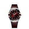 This 41 mm stainless steel and 18K Sedna™ Gold model features a polished black ceramic bezel with Roman numerals in OMEGA Ceragold™. The sun-brushed dial is lacquered for a glossy look, and features a gradient effect that transitions from burgundy to black. There is a date window at the 6 o’clock position, while the hands, OMEGA logo, Constellation star and facetted indexes are all crafted in 18K Sedna™ Gold.