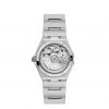 This 34 mm model in stainless steel features a bezel with engraved Roman Numerals, a sun-brushed peacock blue dial, and a round date window at the 6 o’clock position. The incremental diamond hour markers are presented in 18K white gold holders, while the Small Seconds subdial and Central Minute Track are circled by rings. The hands, OMEGA logo and Constellation star are also in 18K white gold.