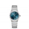 This 34 mm model in stainless steel features a bezel with engraved Roman Numerals, a sun-brushed peacock blue dial, and a round date window at the 6 o’clock position. The incremental diamond hour markers are presented in 18K white gold holders, while the Small Seconds subdial and Central Minute Track are circled by rings. The hands, OMEGA logo and Constellation star are also in 18K white gold.