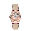 Presented on a shimmering burgundy leather strap, the timepiece is driven by the OMEGA Co-Axial Master Chronometer Calibre 8803, visible through the domed scratch-resistant sapphire crystal.
