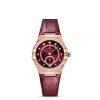 Presented on a shimmering burgundy leather strap, the timepiece is driven by the OMEGA Co-Axial Master Chronometer Calibre 8803, visible through the domed scratch-resistant sapphire crystal.