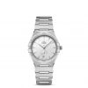 This 34 mm model in stainless steel features a bezel with engraved Roman Numerals, a crystal white silvery dial, and a round date window at the 6 o’clock position. The polished hour markers, hands, OMEGA logo and Constellation star are all in 18K white gold, while the Small Seconds subdial and Central Minute Track are circled by rings.