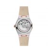 This 34 mm model in 18K Sedna™ gold and stainless steel features a diamond-paved bezel, white pearled mother-of-pearl dial, and a round date window at the 6 o’clock position. The incremental diamond hour markers are presented in 18K Sedna™ gold holders, while the Small Seconds subdial ring is also crafted in 18K Sedna™ gold and set with diamonds.