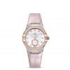This 34 mm model in 18K Sedna™ gold and stainless steel features a diamond-paved bezel, white pearled mother-of-pearl dial, and a round date window at the 6 o’clock position. The incremental diamond hour markers are presented in 18K Sedna™ gold holders, while the Small Seconds subdial ring is also crafted in 18K Sedna™ gold and set with diamonds.