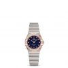 This 25 mm 18K Sedna™ gold and stainless steel model features a diamond-paved bezel and a blue aventurine glass dial with diamond hour markers. The hands, OMEGA logo, Constellation star and diamond holders are also in 18K Sedna™ gold.