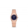 This 25 mm 18K Sedna™ gold model features a diamond-paved bezel and a blue aventurine glass dial with diamond hour markers. The bracelet, hands, OMEGA logo, Constellation star and diamond holders are also in 18K Sedna™ gold.