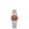 This 25 mm 18K Sedna™ gold and stainless steel model features a bezel engraved with Roman numerals, sun-brushed brown dial and scratch-resistant saphire crystal. The hands, OMEGA logo, Constellation star and indexes are also in 18K Sedna™ gold.