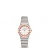 This 25 mm 18K Sedna™ gold and stainless steel model features a bezel engraved with Roman numerals, crystal white silvery dial and scratch-resistant saphire crystal. The hands, OMEGA logo, Constellation star and indexes are also in 18K Sedna™ gold.