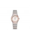 This 25 mm 18K Sedna™ gold and stainless steel model features a diamond-paved bezel, crystal white silvery dial with diamond hour markers and scratch-resistant saphire crystal. The hands, OMEGA logo, Constellation star and diamond holders are also in 18K Sedna™ gold.