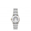 This 25 mm 18K yellow gold and stainless steel model features a diamond-paved bezel, crystal white silvery dial with diamond hour markers and scratch-resistant saphire crystal. The hands, OMEGA logo, Constellation star and diamond holders are also in 18K yellow gold.