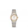 This 25 mm 18K yellow gold and stainless steel model features a diamond-paved bezel, crystal white silvery dial with diamond hour markers and scratch-resistant saphire crystal. The hands, OMEGA logo, Constellation star and diamond holders are also in 18K yellow gold.
