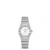 This 25 mm stainless steel model features a bezel engraved with Roman numerals, white mother-of-pearl dial with diamond hour markers and scratch-resistant saphire crystal. The hands, OMEGA logo, Constellation star and diamond holders are in 18K white gold.