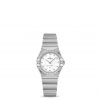 This 25 mm stainless steel model features a diamond-paved bezel, white mother-of-pearl dial with diamond hour markers and scratch-resistant saphire crystal. The hands, OMEGA logo, Constellation star and diamond holders are in 18K white gold.