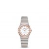 This 25 mm 18K Sedna™ gold and stainless steel model features a diamond-paved bezel, white mother-of-pearl dial with diamond hour markers and scratch-resistant saphire crystal. The hands, OMEGA logo, Constellation star and diamond holders are also in 18K Sedna™ gold.