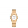This 25 mm 18K yellow gold model features a bezel engraved with Roman numerals, white mother-of-pearl dial with diamond hour markers and scratch-resistant sapphire crystal. The bracelet, hands, OMEGA logo, Constellation star and diamond holders are also in 18K yellow gold.