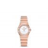 This 25 mm 18K Sedna™ gold model features a diamond-paved bezel, white mother-of-pearl dial with diamond hour markers and scratch-resistant saphire crystal. The bracelet, hands, OMEGA logo, Constellation star and diamond holders are also in 18K Sedna™ gold.