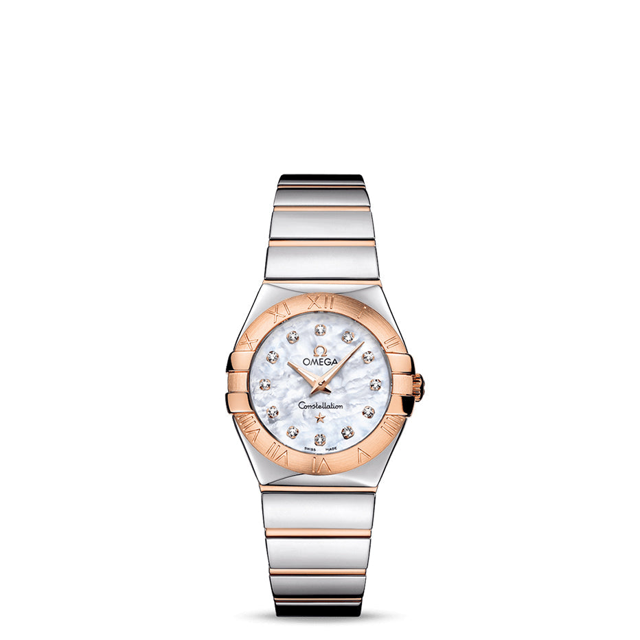 This polished model features a white mother-of-pearl dial marked with diamond-set indexes and covered by a scratch-resistant sapphire crystal. The 18K red gold bezel, with its engraved Roman numerals, is mounted on a 27 mm stainless steel casebody, and is presented on a stainless steel and 18K red gold bracelet.