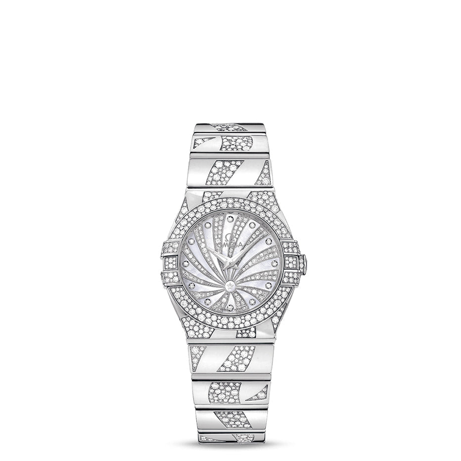 This luxurious model features an 18K gold dial decorated with diamonds and a white mother-of-pearl supernova pattern, and covered by a scratch-resistant sapphire crystal. The bezel, with diamonds arranged in a snow-set pattern, is mounted on a 27 mm 18K white gold case, and is presented on an 18K white gold bracelet with a diamond-paved supernova pattern extending from the dial.