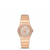 This brushed model features a white mother-of-pearl dial marked with diamond-set hour indexes, decorated with the OMEGA logo in a random pattern and covered by a scratch-resistant sapphire crystal. The diamond-set bezel is mounted on a 27 mm 18K yellow gold case, and is presented on an 18K yellow gold bracelet.